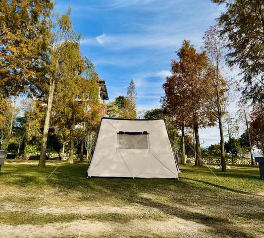 天幕帳本體前後庭皆有三拉鍊設計可快速連接拓展圍布,拓展部分可依據需求放下包覆或是捲起打開,也可配合營柱撐起展開增加額外的遮蔽面積.